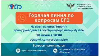 Уважаемые коллеги, информируем Вас о том, что 18 июня 2020 года врио руководителя Рособрнадзора А.А. Музаев будет отвечать в прямом эфире на вопросы о проведении ЕГЭ в 2020 году. Просим Вас разослать анонс горячей линии и привлечь к просмотру максимальное количество людей – выпускников, родителей, учителей и журналистов. Анонс - http://obrnadzor.gov.ru/ru/press_center/news/index.php?id_4=7345